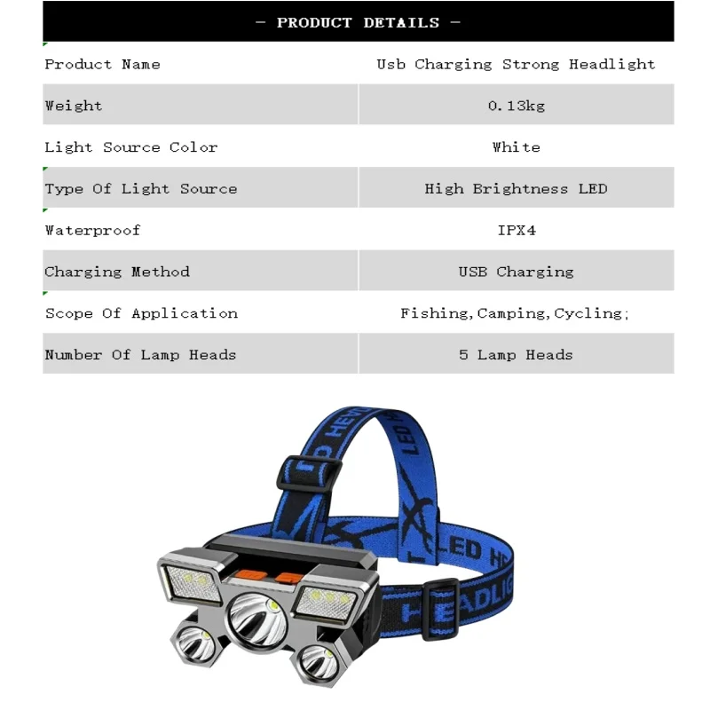• Powerful LED Light :This strong headlight LED light is designed with five heads, providing powerful illumination for outdoor activities.